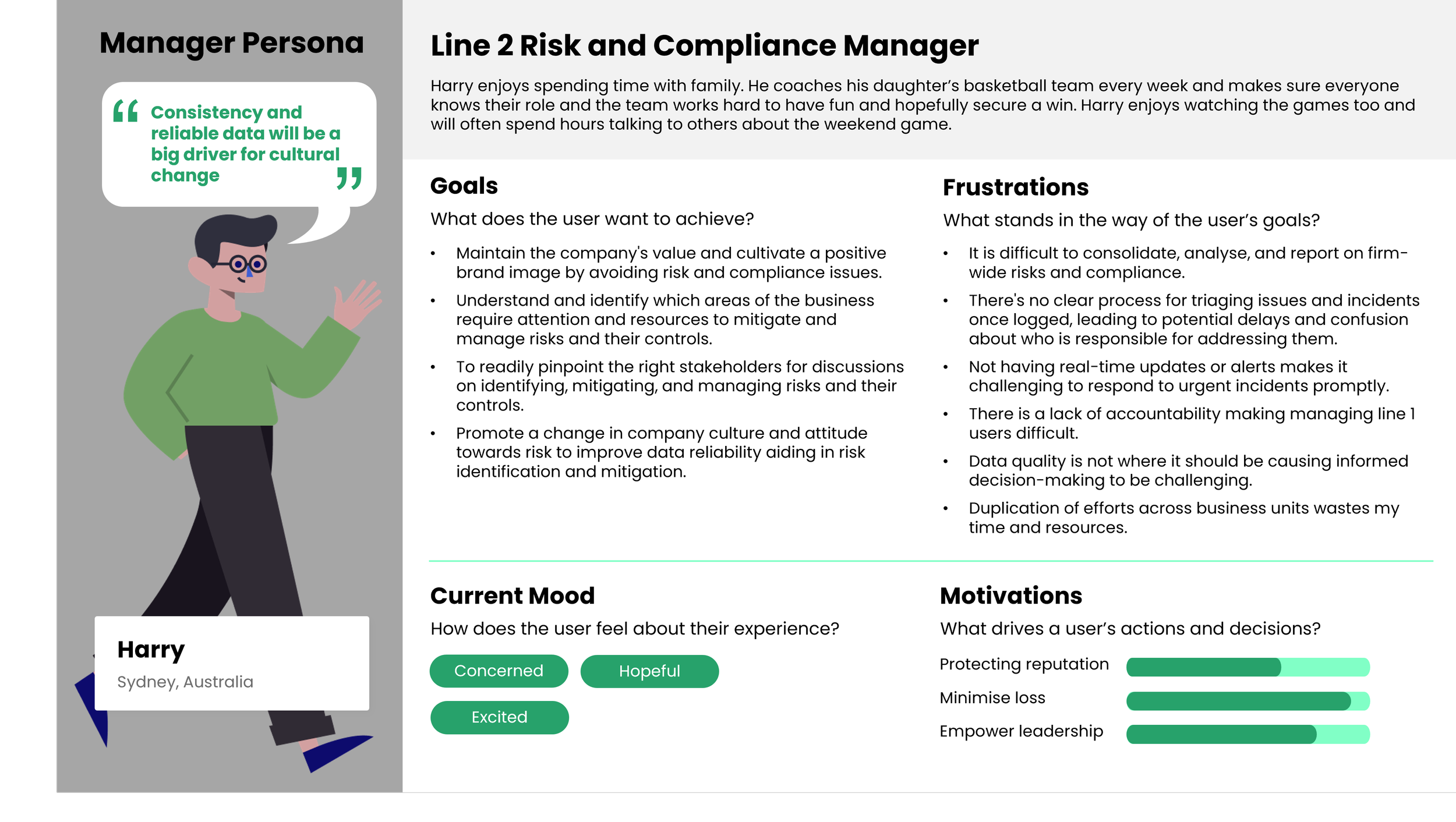 To gain an understanding about user sentiment towards risk management tools, I conducted a total of 5 1:1 interviews and moderated card sorting sessions with risk and compliance stakeholders.